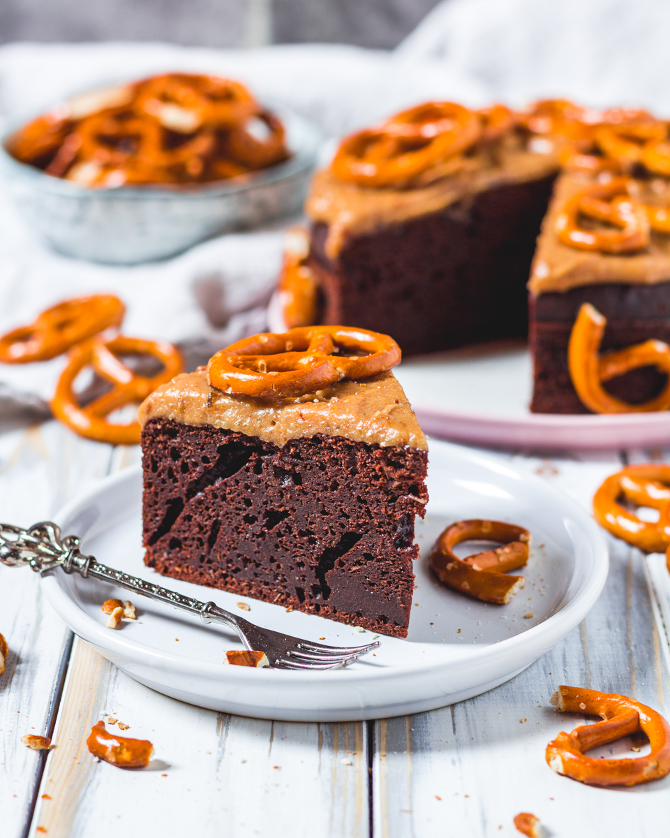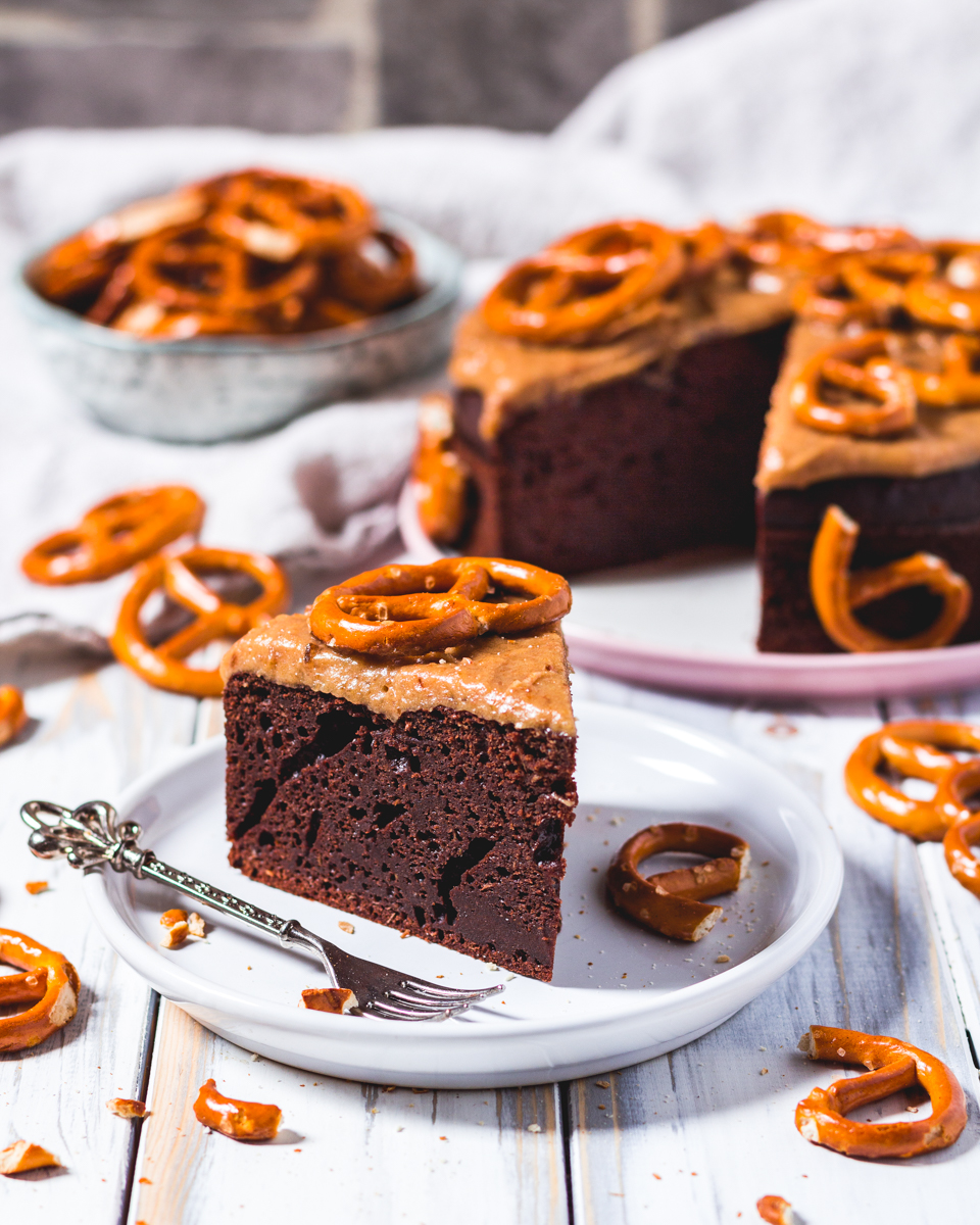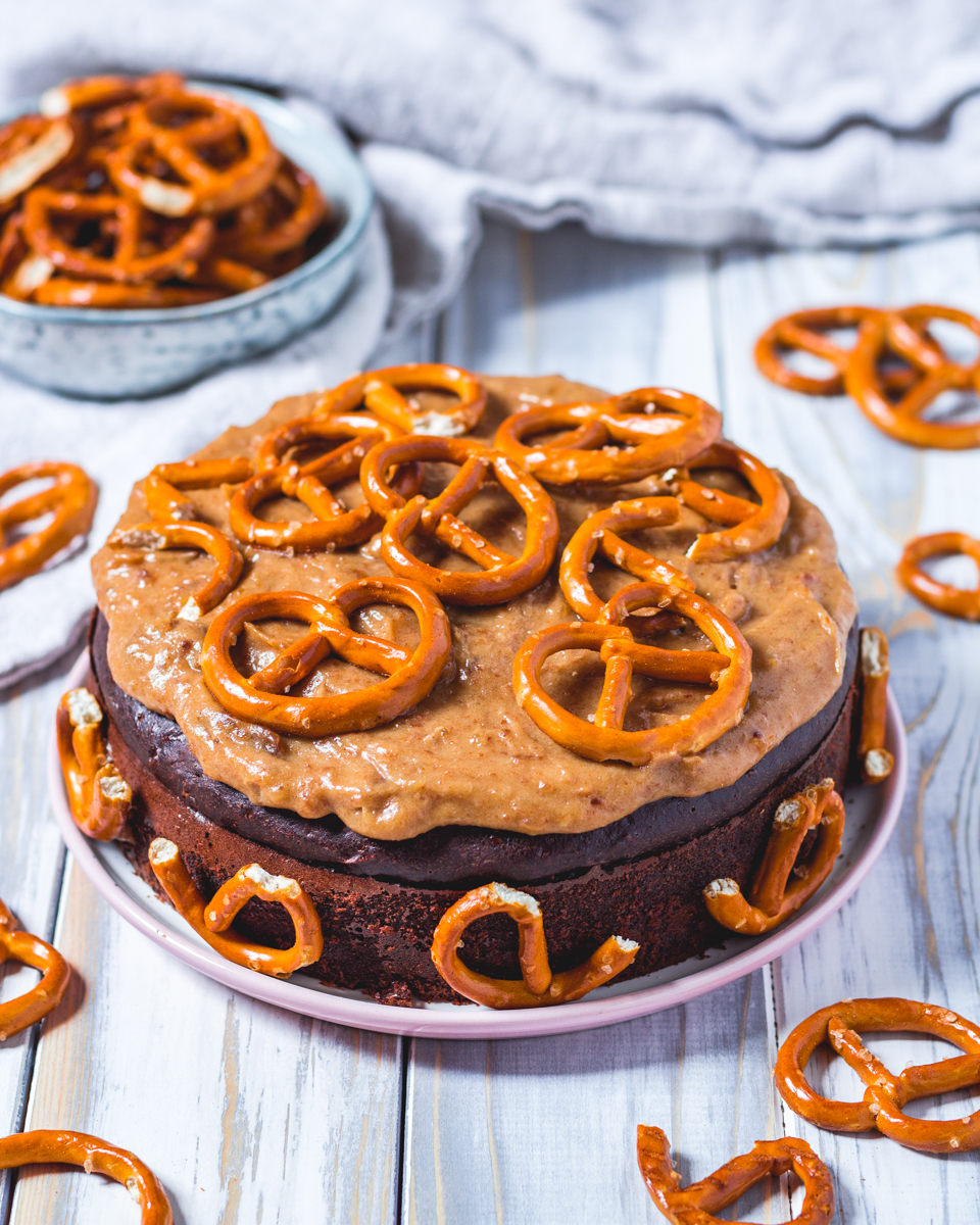 Brownie Protein Kuchen mit Karamell- Brezel Topping