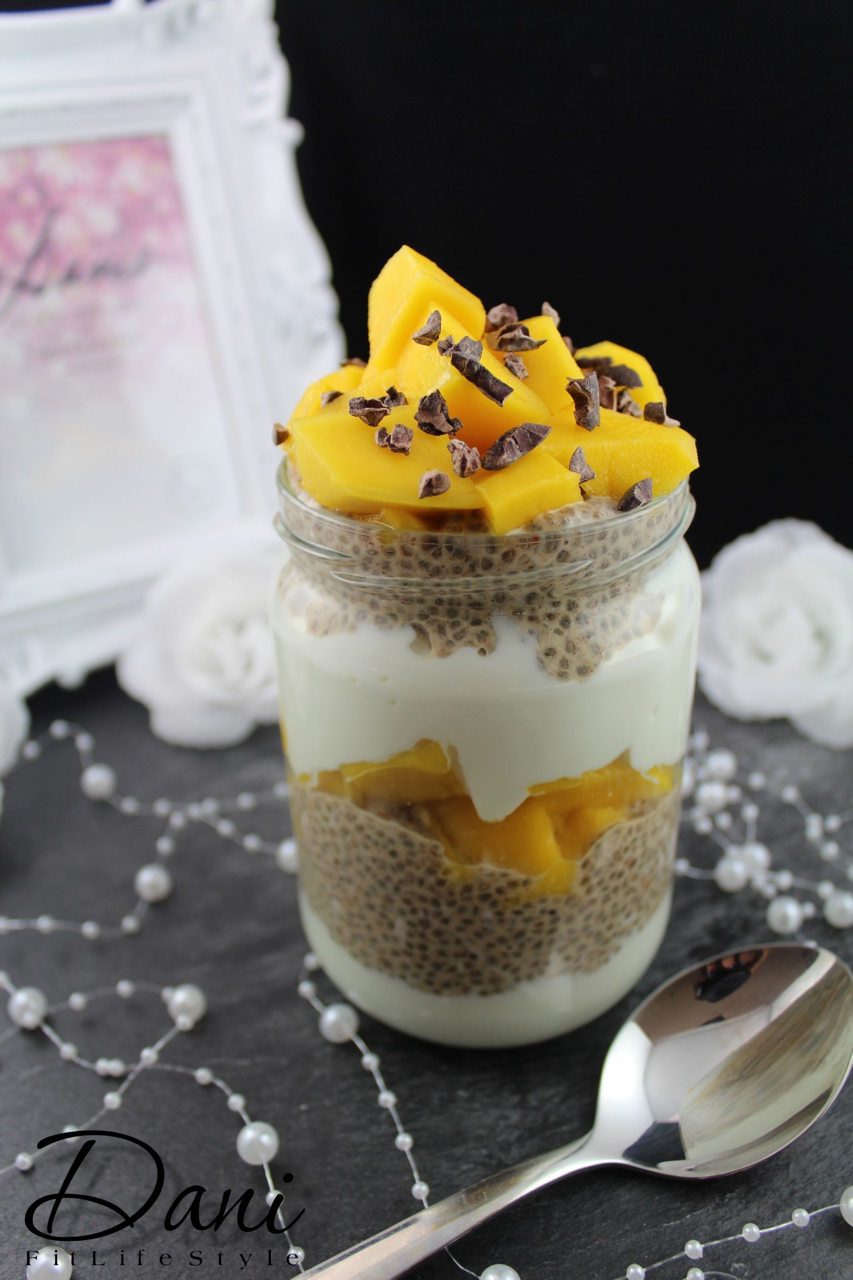 Abwechselnd mit Chia-Pudding und Mango geschichtet und mit Kakaonibs getoppt ![]()