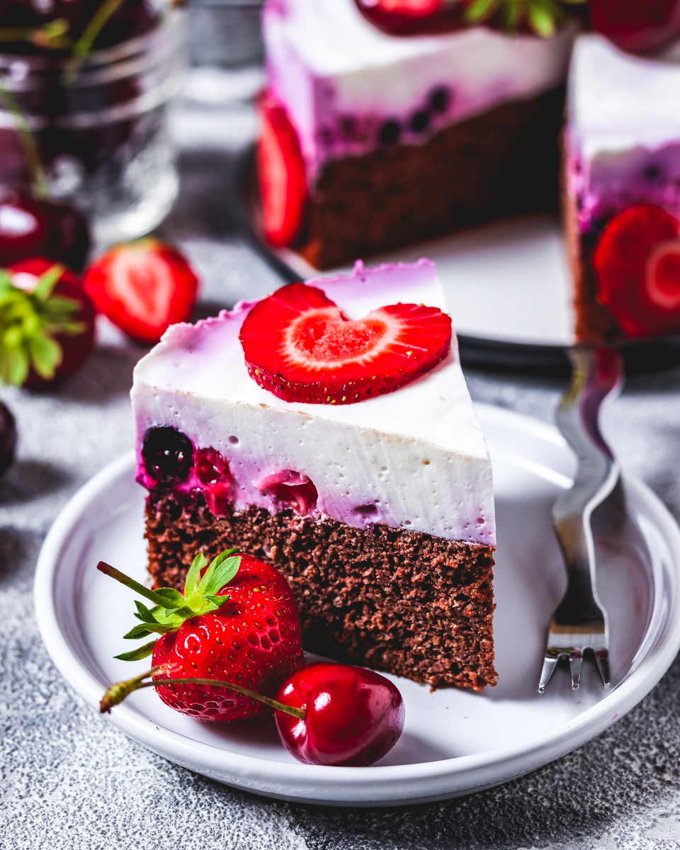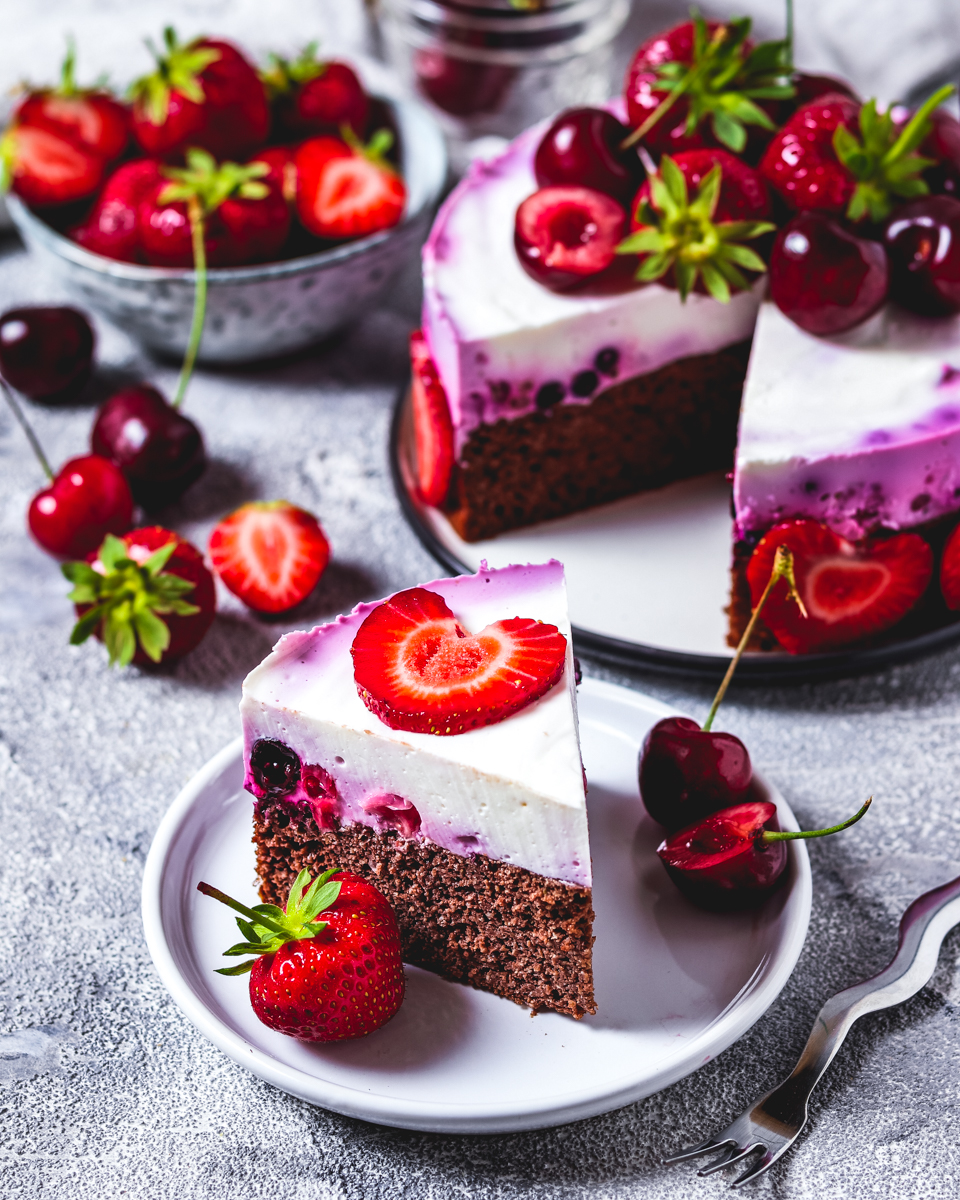 Schoko- Chai Kuchen mit griechischem Joghurt und Beeren