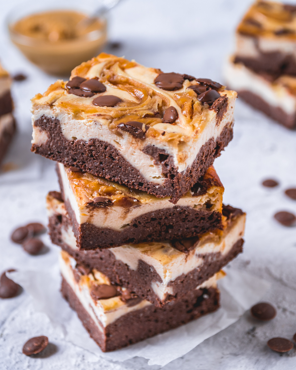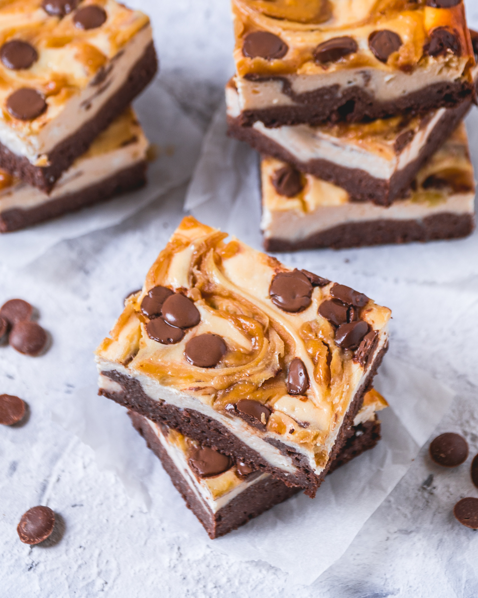Mit gerade Mal 140 kcal das Stück ist hier auf keinen Fall von einer Kalorienbombe die Rede. Dazu kommen ganze 14g Eiweiß… Wie ich finde einfach der ideale Snack für Zwischendurch, als Nachtisch oder doch lieber gleich zum Frühstück zu genießen. Und von dem bisschen Erdnussbutter ist auch noch niemand dick geworden ? Ganz im Gegenteil. Sie liefert sehr gesunde Fette und macht den Käsekuchen nochmal doppelt so lecker. Natürlich kann sie auch durch jede andere Nussbutter ersetzt werden oder für Allergiker: Karamell- Creme wäre an dieser Stelle vermutlich auch der Hammer ?