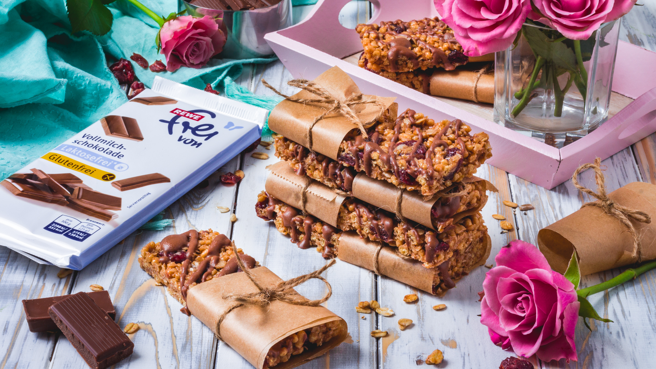 Anzeige/ Ob zum Frühstück, als Snack für unterwegs oder vor bzw. nach dem Training – Müsliriegel schmecken einfach immer. ? Besonders, wenn es dabei noch gesunde Fitnessriegel mit Schokolade sind. ? Ich benutze seit einiger Zeit sehr gerne die laktosefreie Schokolade von REWE, weil ich gemerkt habe, dass ich die „REWE frei von“ Produkte ohne Laktose viel besser vertrage als herkömmliche Milchprodukte. Die Produkte sind speziell für Menschen mit einer Laktoseintoleranz entwickelt worden. Darum können auch mein Freund, sowie alle meine Freunde (egal ob mit oder ohne Laktoseintoleranz) jederzeit unbeschwert von meinen Kreationen probieren und ich kann es mit nur einem Rezept allen recht machen. ? Die Schokolade ist im übrigen auch glutenfrei ??♀️